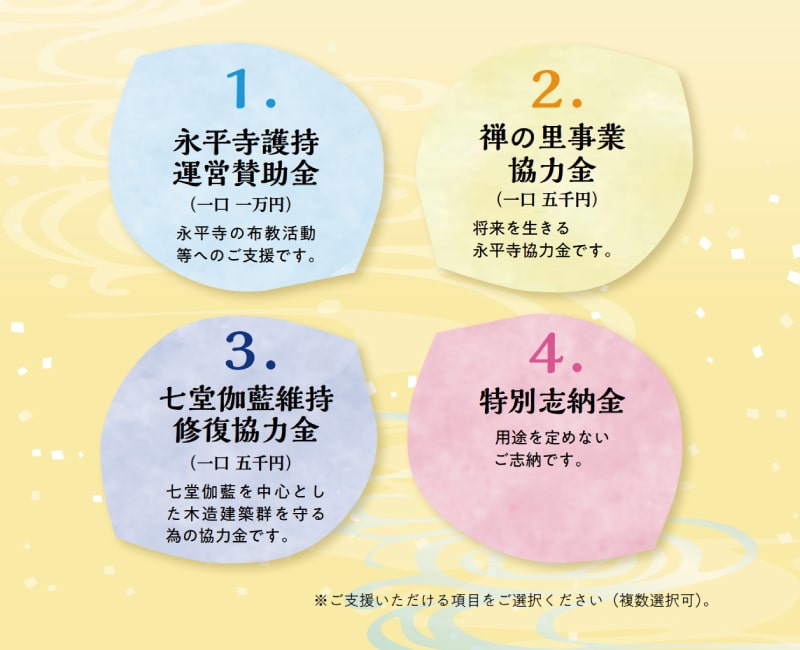 永平寺友の会会員としてご支援頂きます項目は、4つございます。ご自身が一番関心を寄せられる項目を選んで頂いても複数の項目を選んで頂いても結構です。