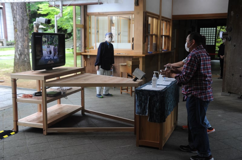 入り口にて手指の消毒とサーモカメラによる検温をお願いしております。
